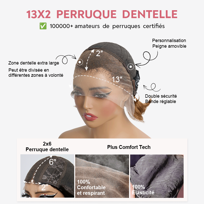 Taille de dentelle | Perruque 1 Highligt Bob:13x2 Dentelle Perruque -300% Densité; Perruque 2 Noir/Ombre brun/Rouge Foncé Bob: 2x6 Dentelle -250% Densité |