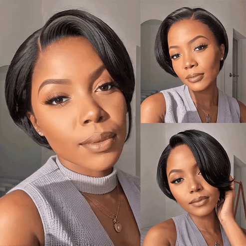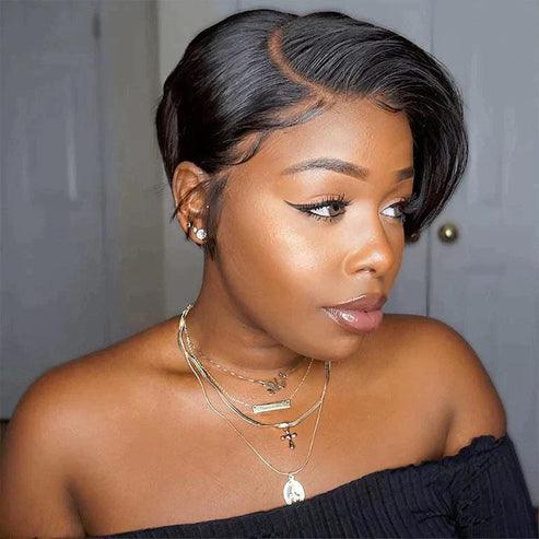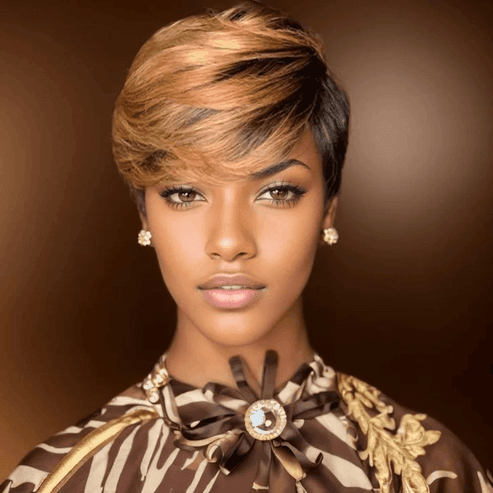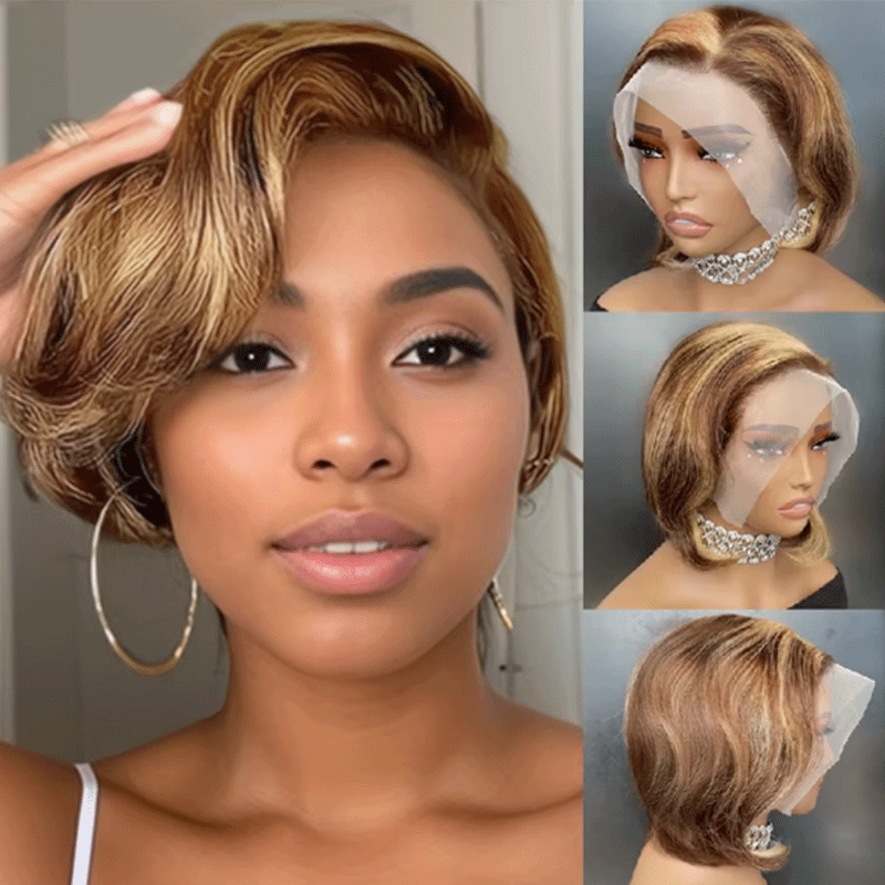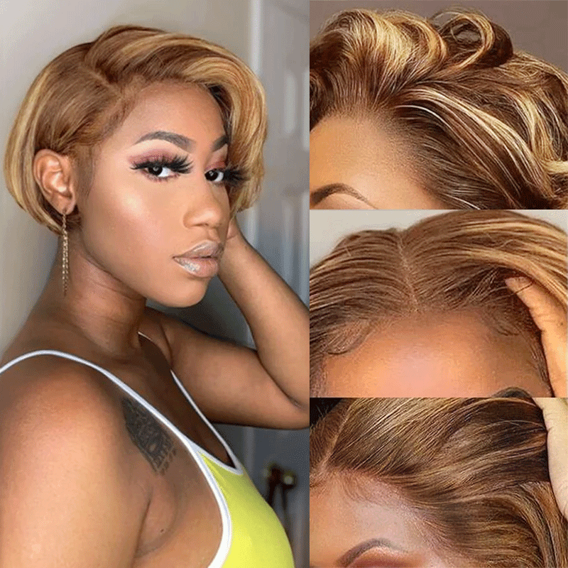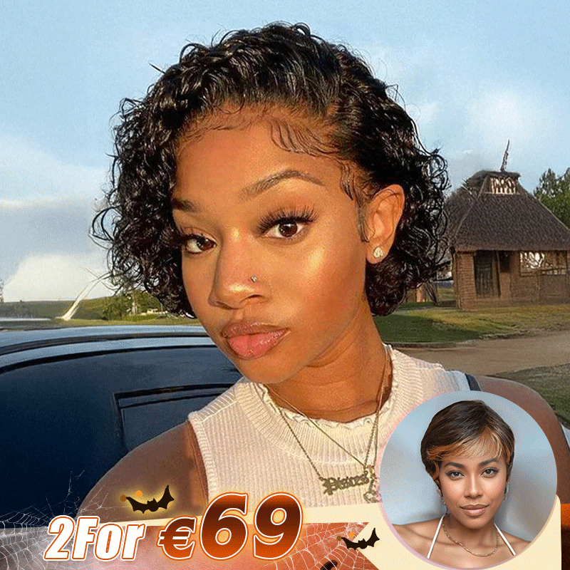 2 𝑭𝑶𝑹 €69🔥Perruque 13×1 Lace Pixie Cut Bouclée +Noir/ Blonde Mélangé Noir/#4-27 Pixie/Ombre Blonde Pixie