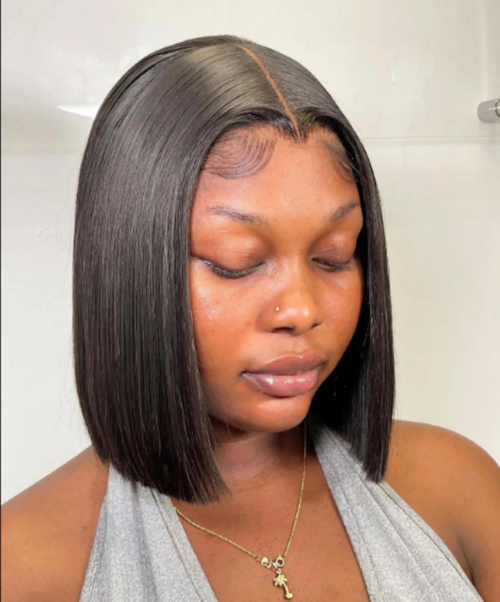 Pour mesurer la longueur d'une perruque droite, partez du centre du bonnet de perruque ou de la tête et mesurez jusqu'à la mèche de cheveux la plus longue en bas.