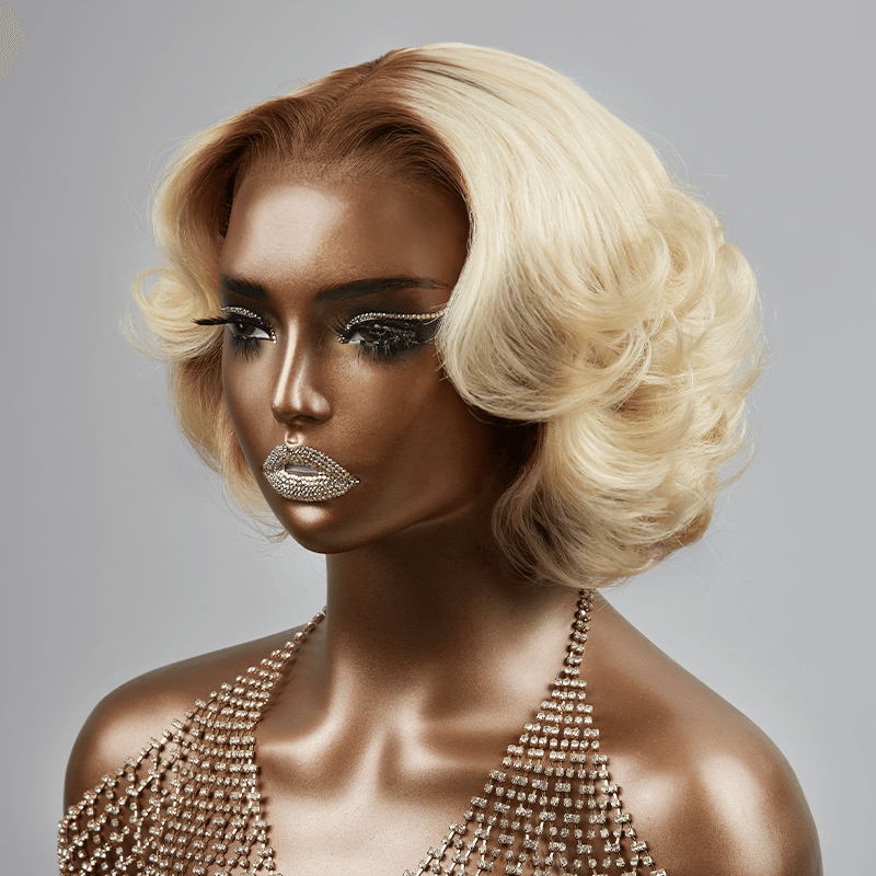13x4 Glueless Couleur Brun Mixte Blond Couche Bob Perruque Sans Colle Ondulé 250% Densité