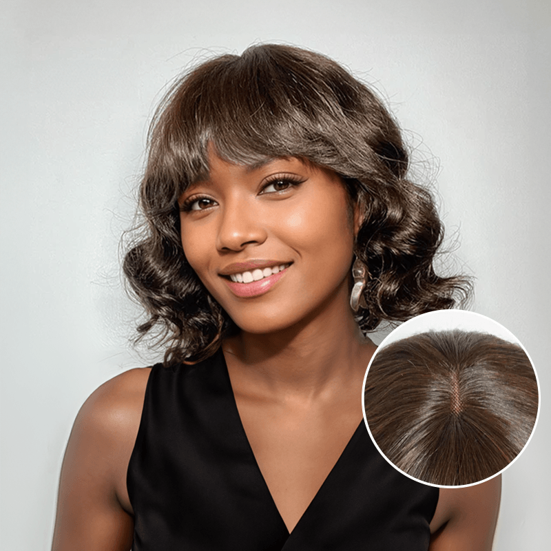 3x1 Dentelle Couleur Chocolat Noir Bob Perruque Longueur Epaules Loose Wave Avec Frange