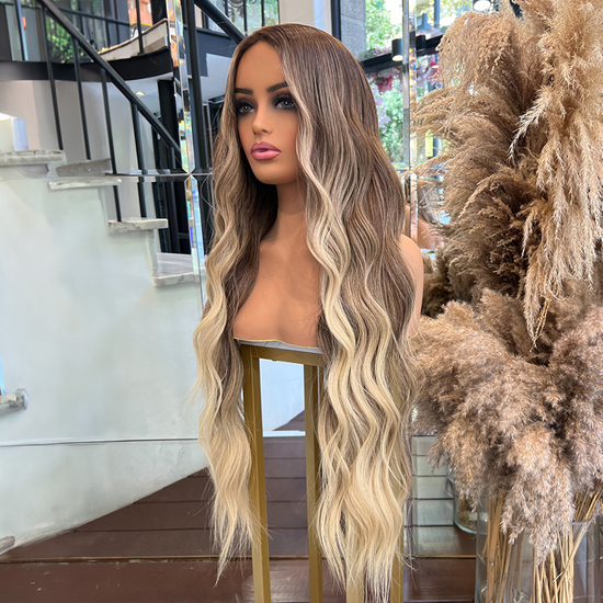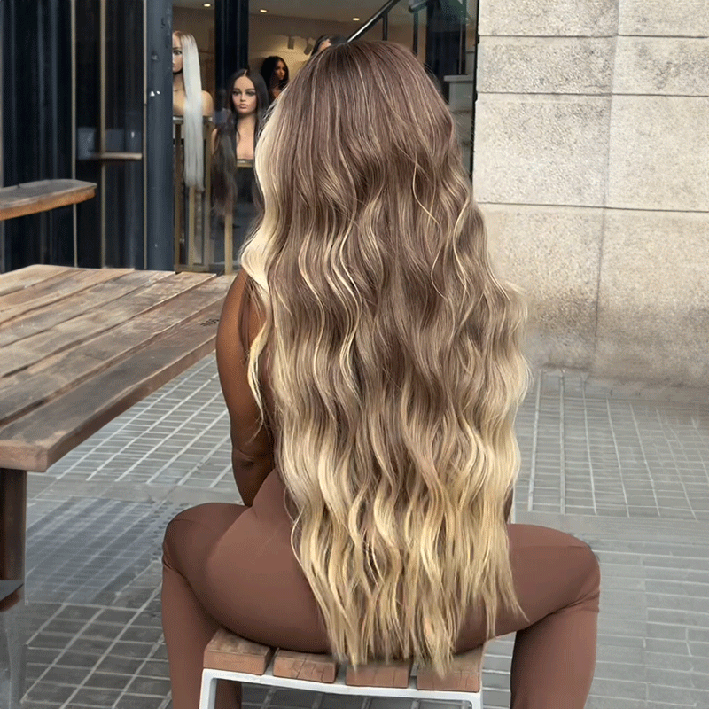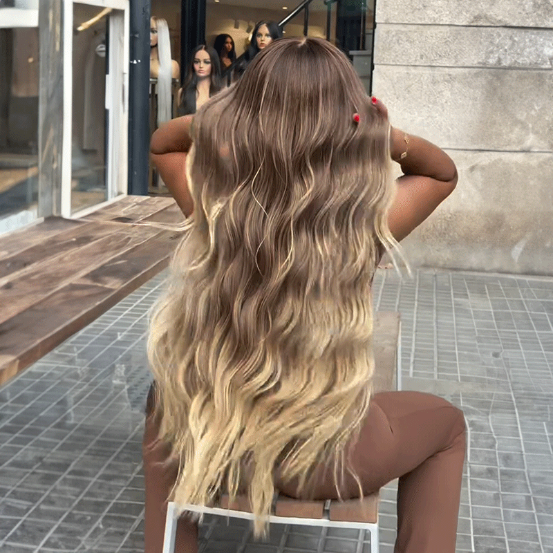 Ultra Volumineuse Glueless Couleur Brun Avec Des Mèches Dégradées Blondes 4x4 Perruque Sans Colle Ondulé 250% Densité