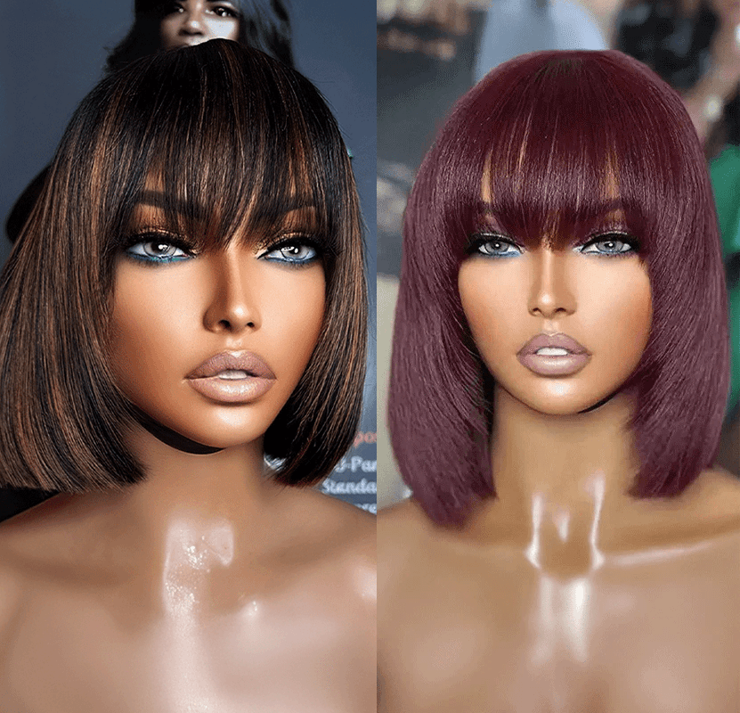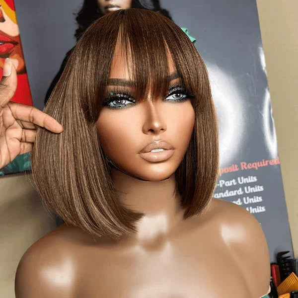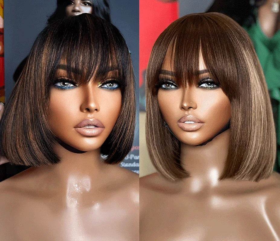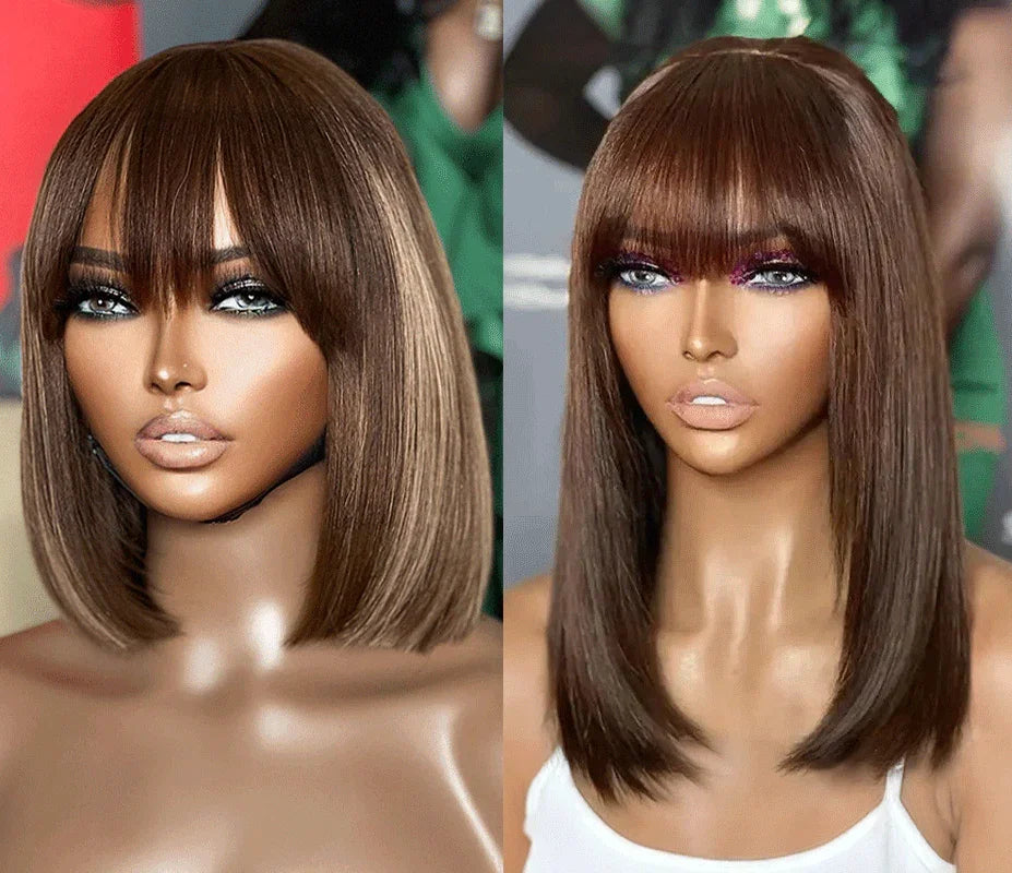 2 𝑭𝑶𝑹 €99🔥 Essentiel De L'Été Soyeux Bob Facile À Coiffer Glueless Perruque Lisse Avec Frange