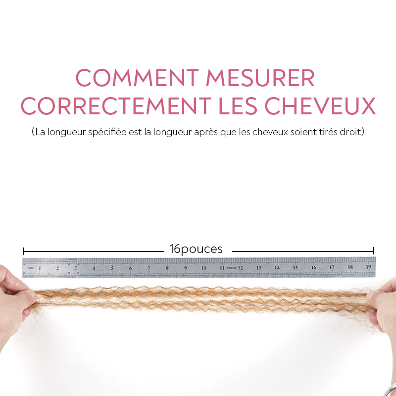 Pour les perruques bouclées et ondulées, vous devez lisser les cheveux avant de les mesurer. Etirez doucement les cheveux jusqu'à leur longueur maximale, puis mesurez du haut de la perruque jusqu'à l'extrémité des cheveux.