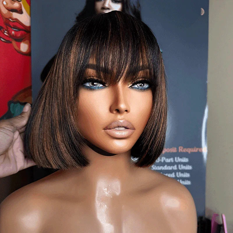 Achetez la perruque de Bob avec frange pour un look instantané et élégant. Fabriquée avec des cheveux humains 100% naturels, elle est également dotée d'une densité de 200% pour une apparence naturelle. Mettez-la facilement pour ajouter une touche féminine à votre look.