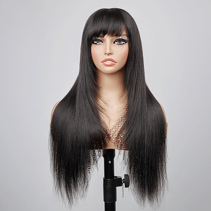 3x1 Dentelle Yaki Straight Perruque Sans Colle Avec Frange Cheveux Humains