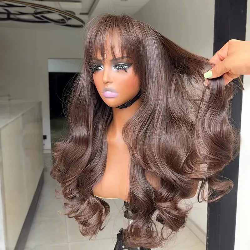 Doux Et Brillant Glueless Sans Nœud Couleur Brun Chocolat 4x4 Perruque Sans Colle Avec Frange