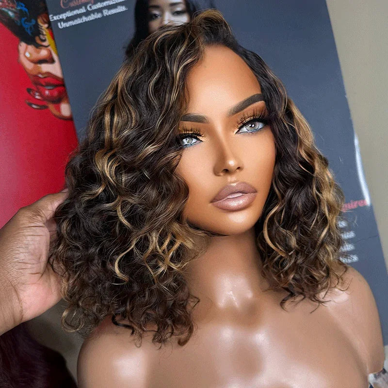 Glueless Couleur Mèches Blondes Miel 7x4 Nœuds Blanchis Perruque Sans Colle Bouclé