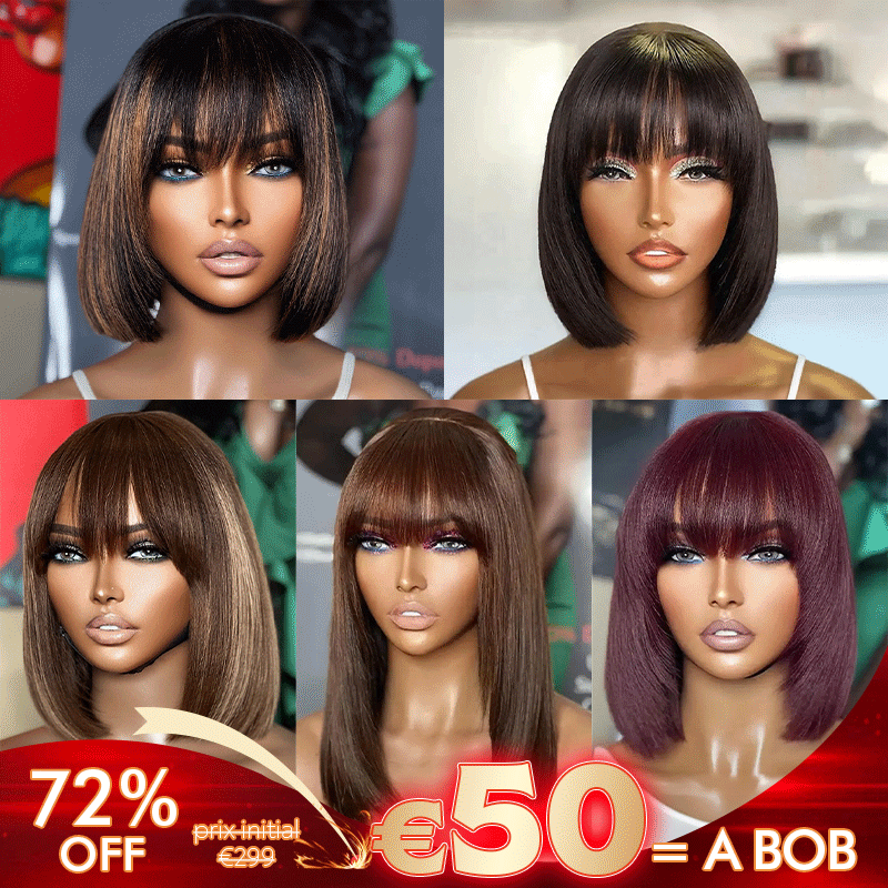 €𝟓𝟎/𝐁𝐨𝐛🔥Soyeux Glueless Bob Perruque 5 Couleur Lisse Avec Frange Prix De Gros D'usine