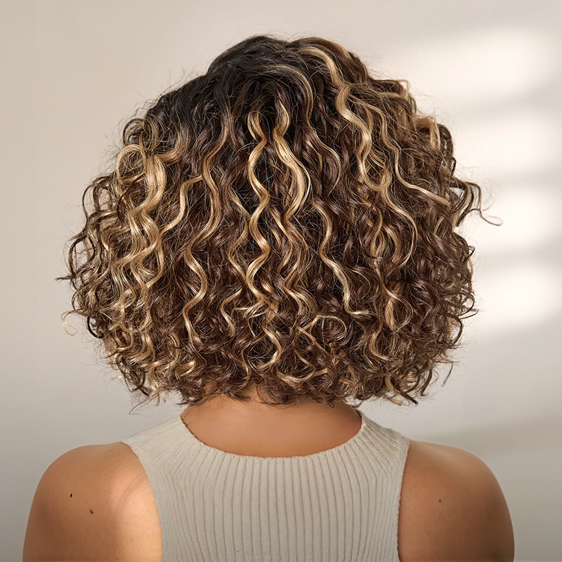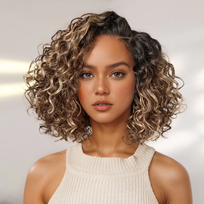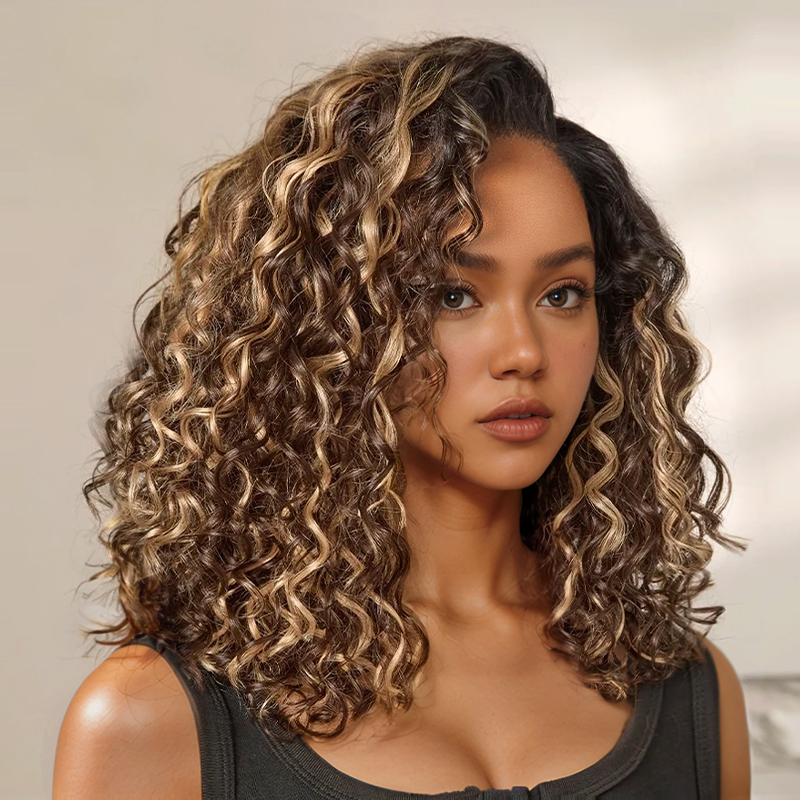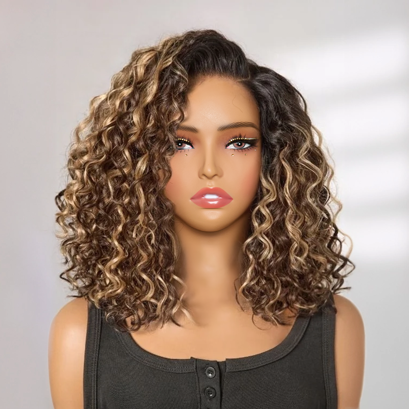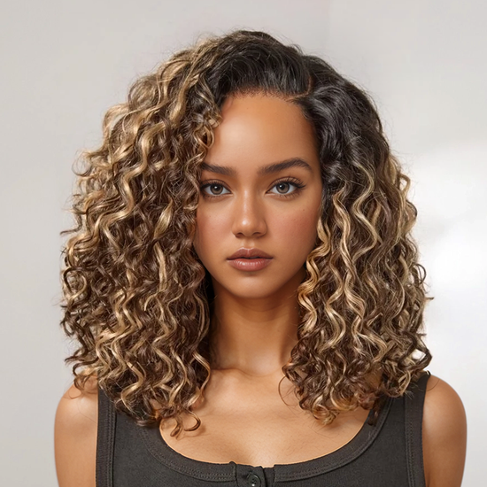 Glueless Couleur Mèches Blondes & Noir Naturel 7x4 Wear Go Perruque Sans Colle Bouclé