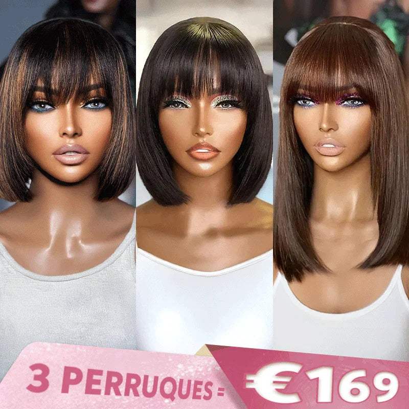 𝟑 𝐏𝐞𝐫𝐫𝐮𝐪𝐮𝐞𝐬=€𝟏𝟔𝟗⚡Pour Débutants Glueless Bob Perruque Cheveux Humains Avec Frange Lisse